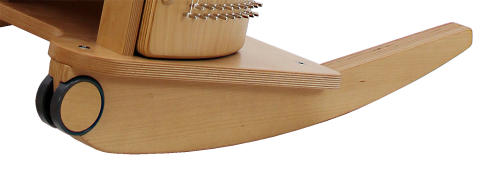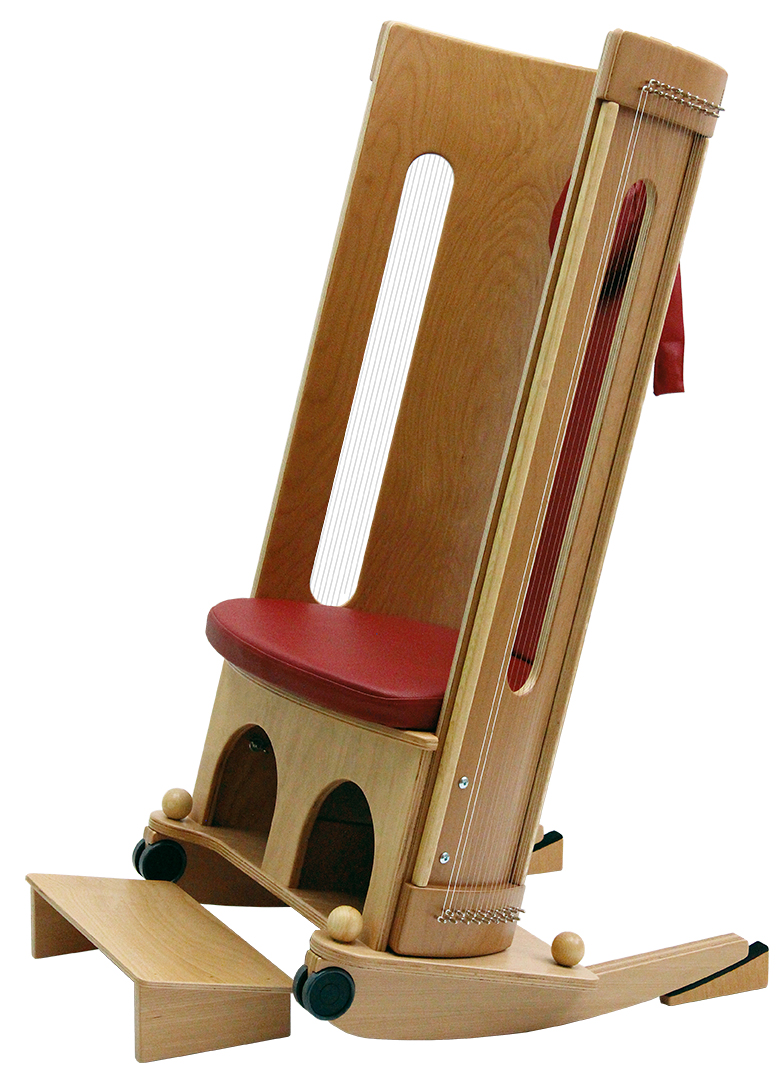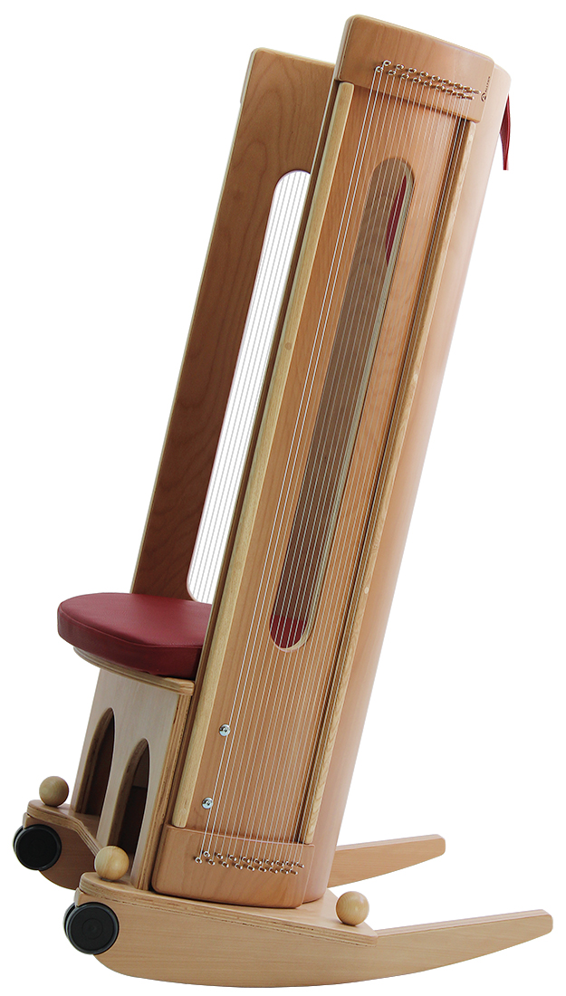 Ein Klangmassage-Schaukelstuhl besteht aus einer Klangwiege, die beidseitig mit je 18 Saiten bespannt ist. Der Sitzeinsatz mit Schaukelkufen ist angeschraubt.
