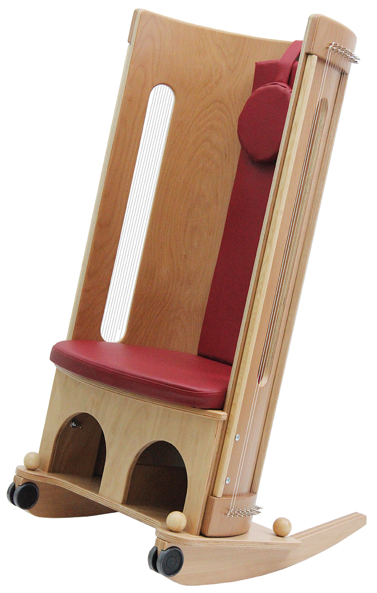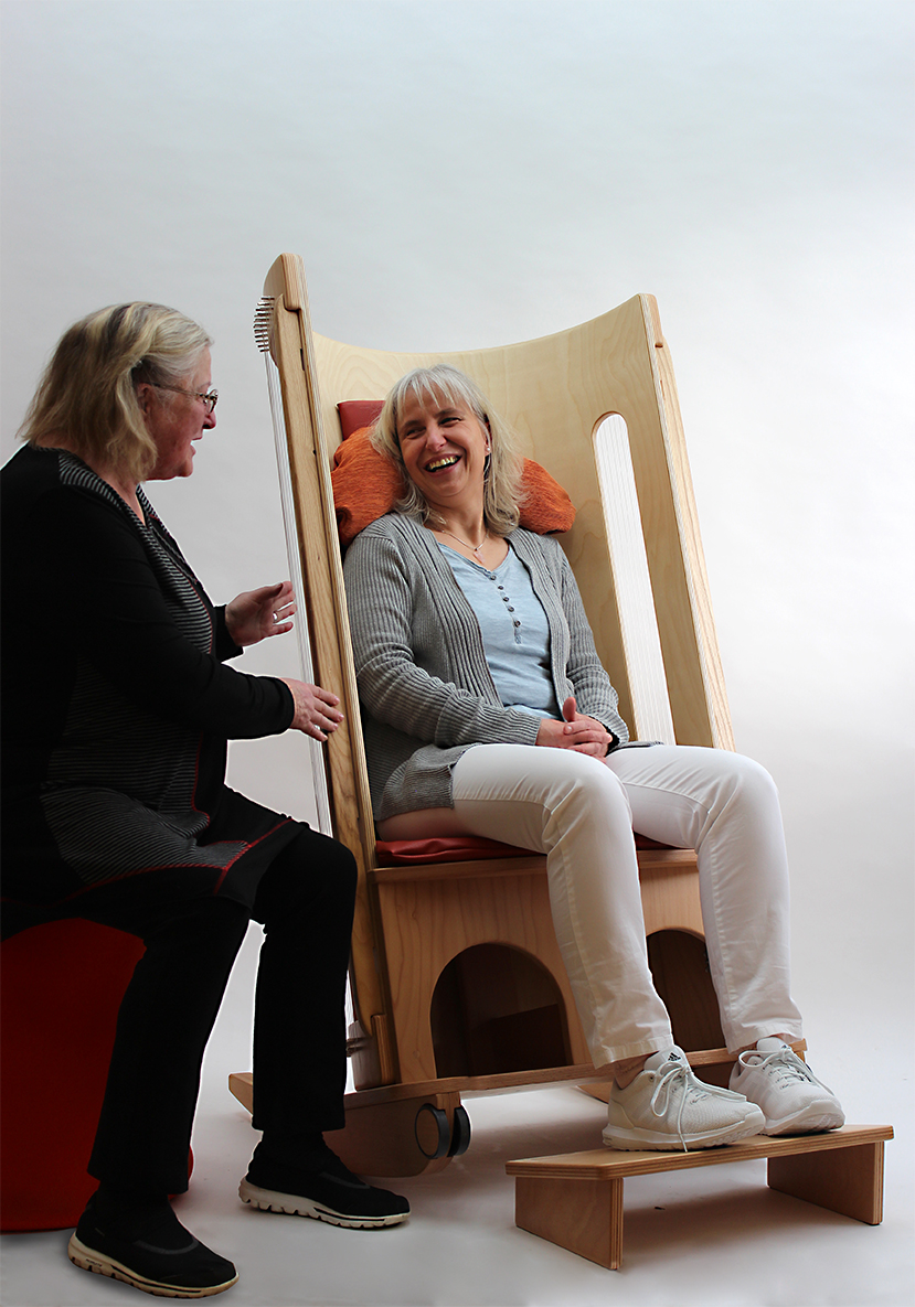 Der Klangmassage-Schaukelstuhl ist besonders für die Pflege geeignet: Er ist rollbar, desinfektionsmitteltauglich und leicht zu bedienen. Der, durch das Spielen auf den Saiten erzeugte Klang erinnert an ein Harfenspiel, das durch seine Harmonie besonders beruhigend auf den Klanggast wirkt. So wird dieser zu Wohlbefinden und tiefer Entspannung geführt. Geborgen im halbrunden Resonanzraum sitzend, sind die Saitenklänge sehr schön zu hören und im ganzen Körper wohltuend spürbar.
