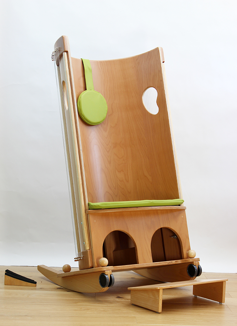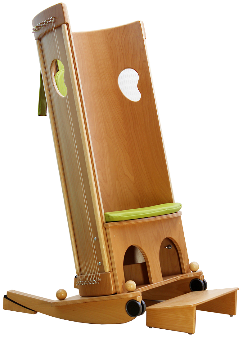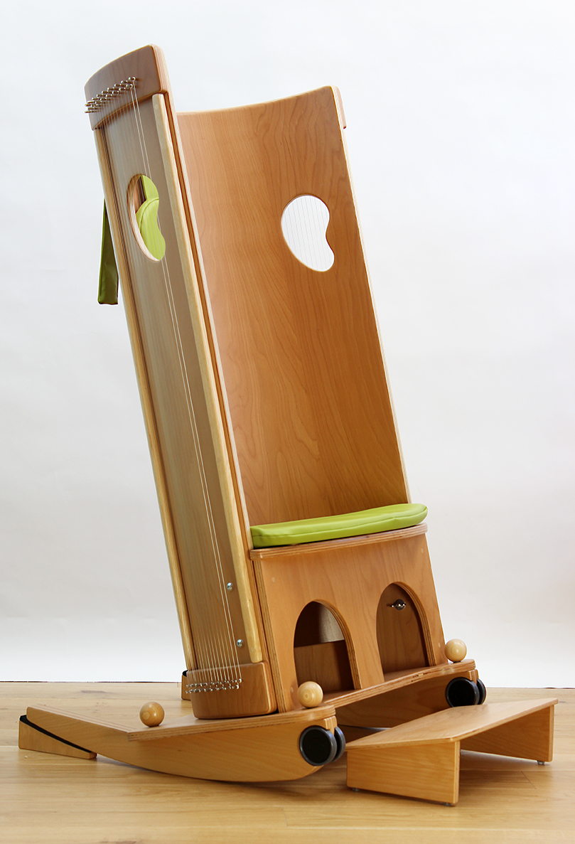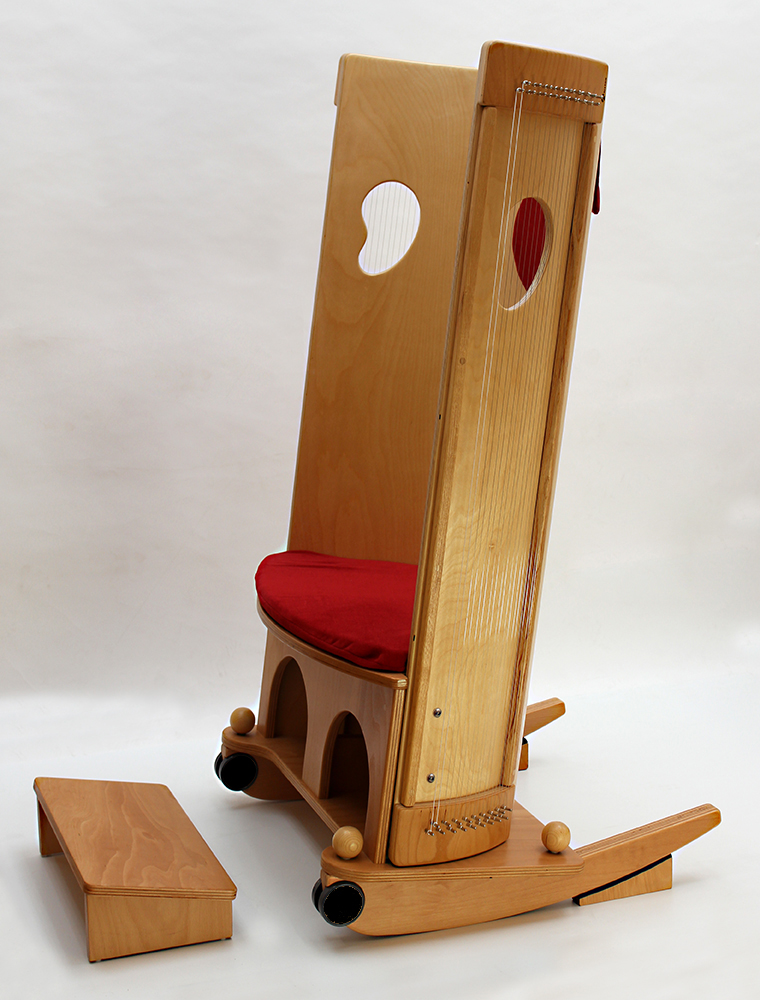 Ein Klangmassage-Schaukelstuhl besteht aus einer Klangwiege, die beidseitig mit je 18 Saiten bespannt ist. Der Sitzeinsatz mit Schaukelkufen ist angeschraubt.