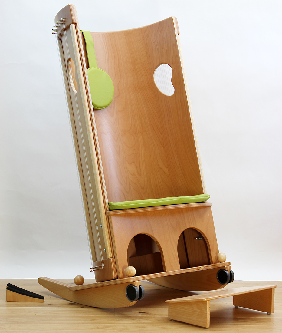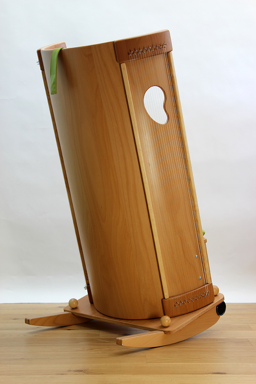 Beidseitig angebrachte, ohrförmige Greiflöcher ermöglichen auch dem Klanggast, im Stuhl sitzend, selbst an die Saiten zu kommen, um auf ihnen zu spielen. Die Greiflöcher sind so positioniert, dass die Hände des Spielenden von innen gesehen werden können. im Vergleich zu unseren Modellen mit langgezogenen Greiflöchern, ist hier die Klangübertragung noch etwas stärker zu fühlen.