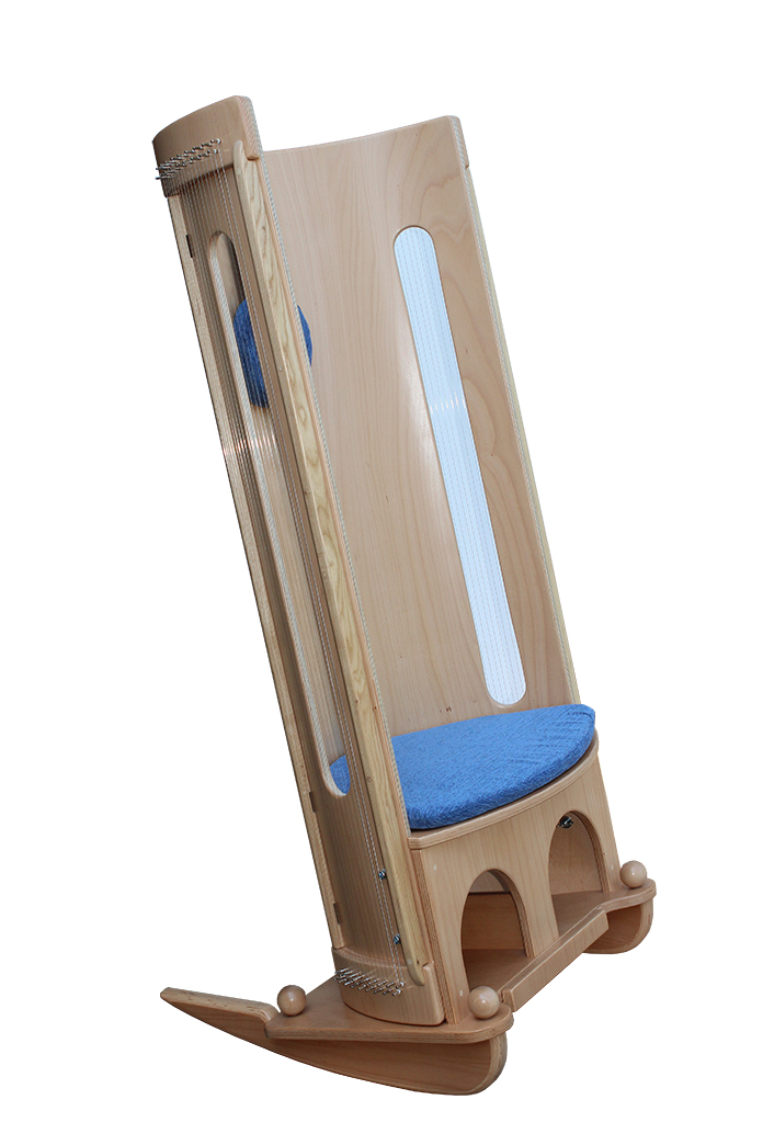 Ein Klangmassage-Schaukelstuhl besteht aus einer Klangwiege, die beidseitig mit je 18 Saiten bespannt ist. Der Sitzeinsatz mit Schaukelkufen ist angeschraubt.