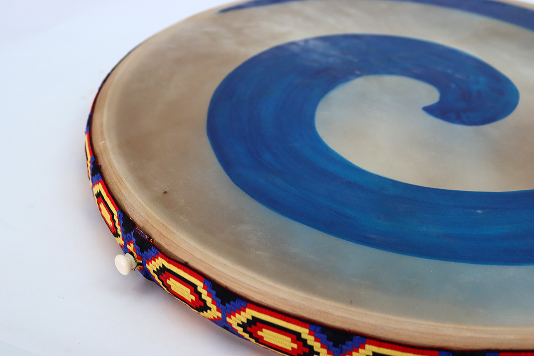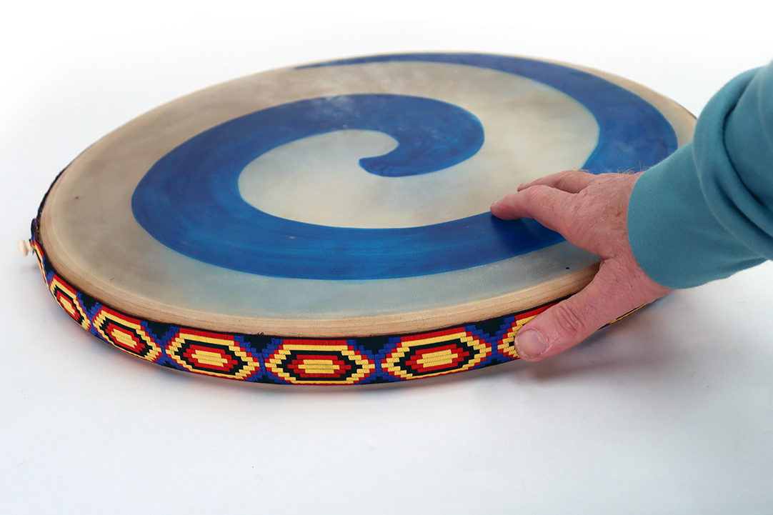 Die blaue Spirale wird in Handarbeit von innen auf das Ziegenfell gemalt. Damit ist jede Trommel ein Unikat. Alle Allton Brandungstrommeln sind mit einem ergonomisch-gerundeten schmaler Holzring gefertigt und gefüllt. Die Kügelchen sind, durch einen Stöpsel im Rahmen auch auswechselbar. Wer leisere Töne bevorzugt, kann auch ein leiser klingendes Naturmaterial als Füllung bekommen.