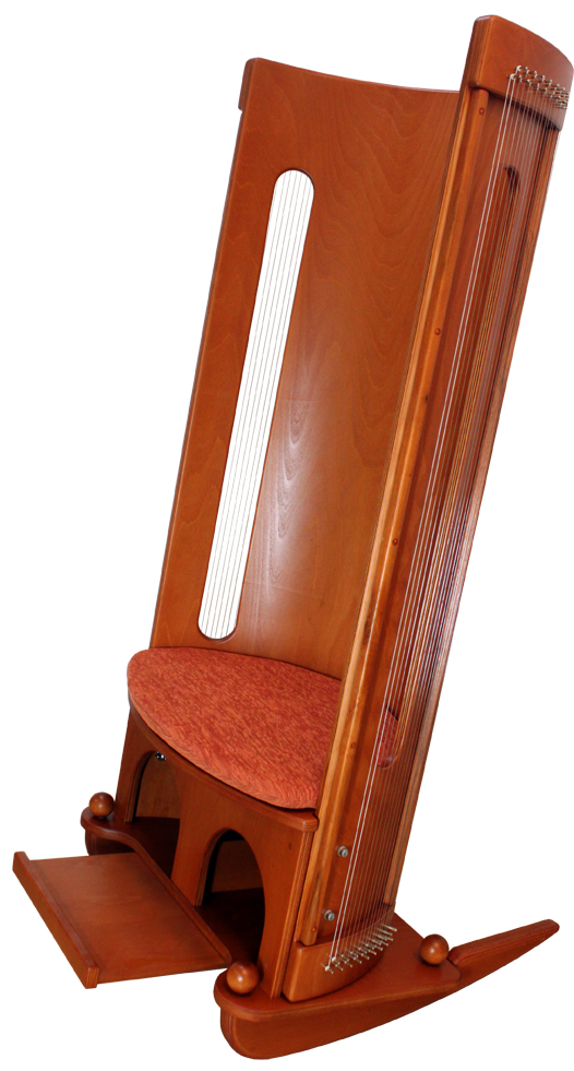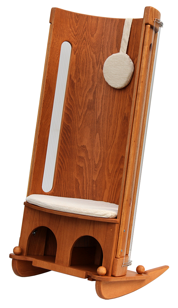 Ein Klangmassage-Schaukelstuhl besteht aus einer Klangwiege, die beidseitig mit je 18 Saiten bespannt ist. Der Sitzeinsatz mit Schaukelkufen ist angeschraubt.