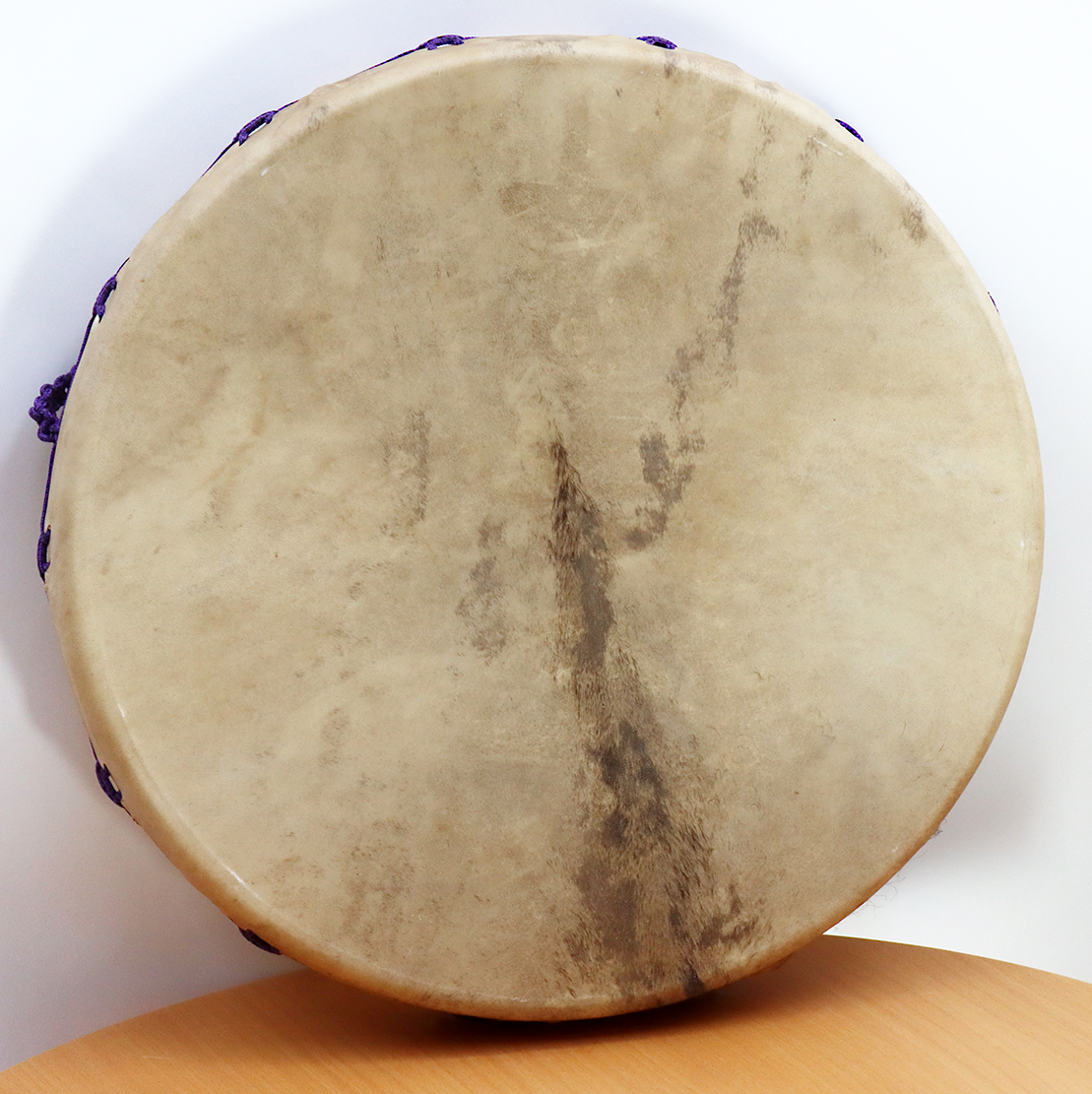 Rahmen aus Buche, schichtverleimt, 45 cm Durchmesser, 9mm stark, 7cm hoch Naturfell mit Schnurbespannung. Durch verschieben der Holzkugeln auf der Rückseite läßt sich die Trommel stimmen