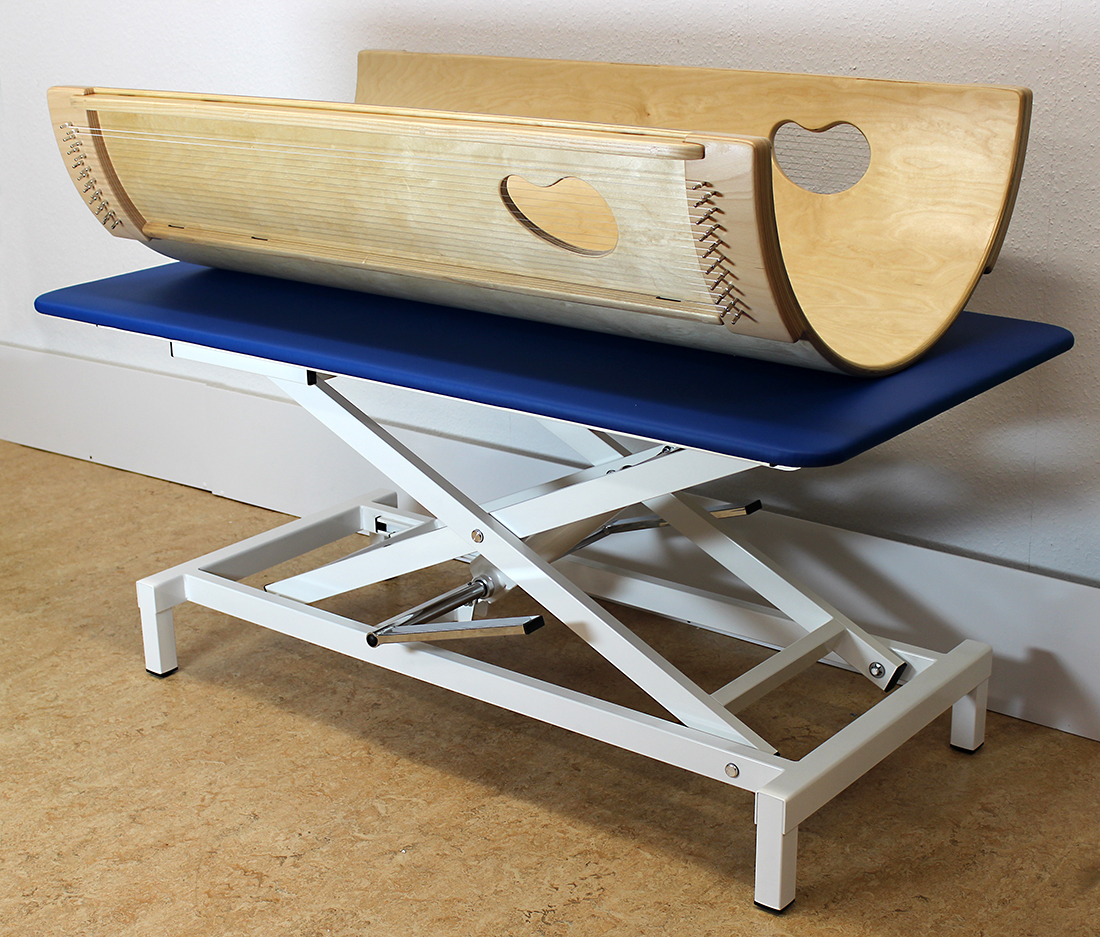 Die Stabilität und die Maße dieser Therapie-Behandlungsliege ermöglichen es, in bequemer Haltung eine Klangwiege bis zu einer Länge von 200 cm zum Einsatz zu bringen.