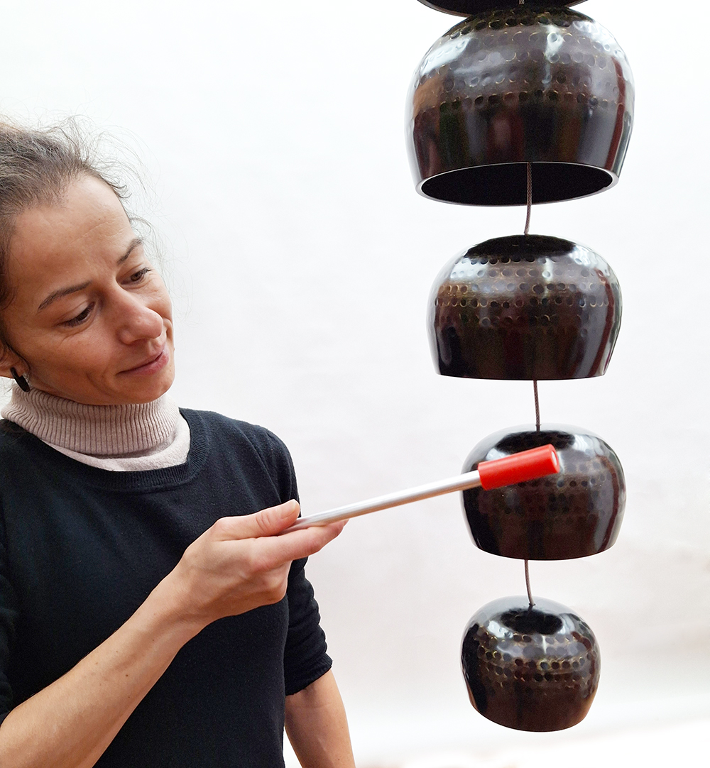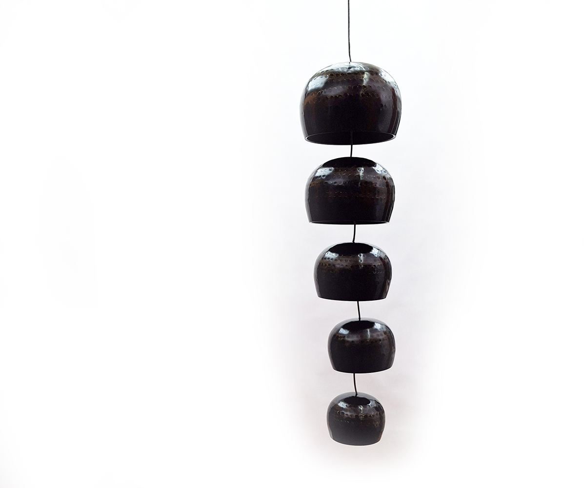 Chinesische Tempelglocken 5 Stück mit Aufhängung aus kunststoffummanteltem Drahtseil 9 - 10,5 - 12 - 13,5 - 15 cm