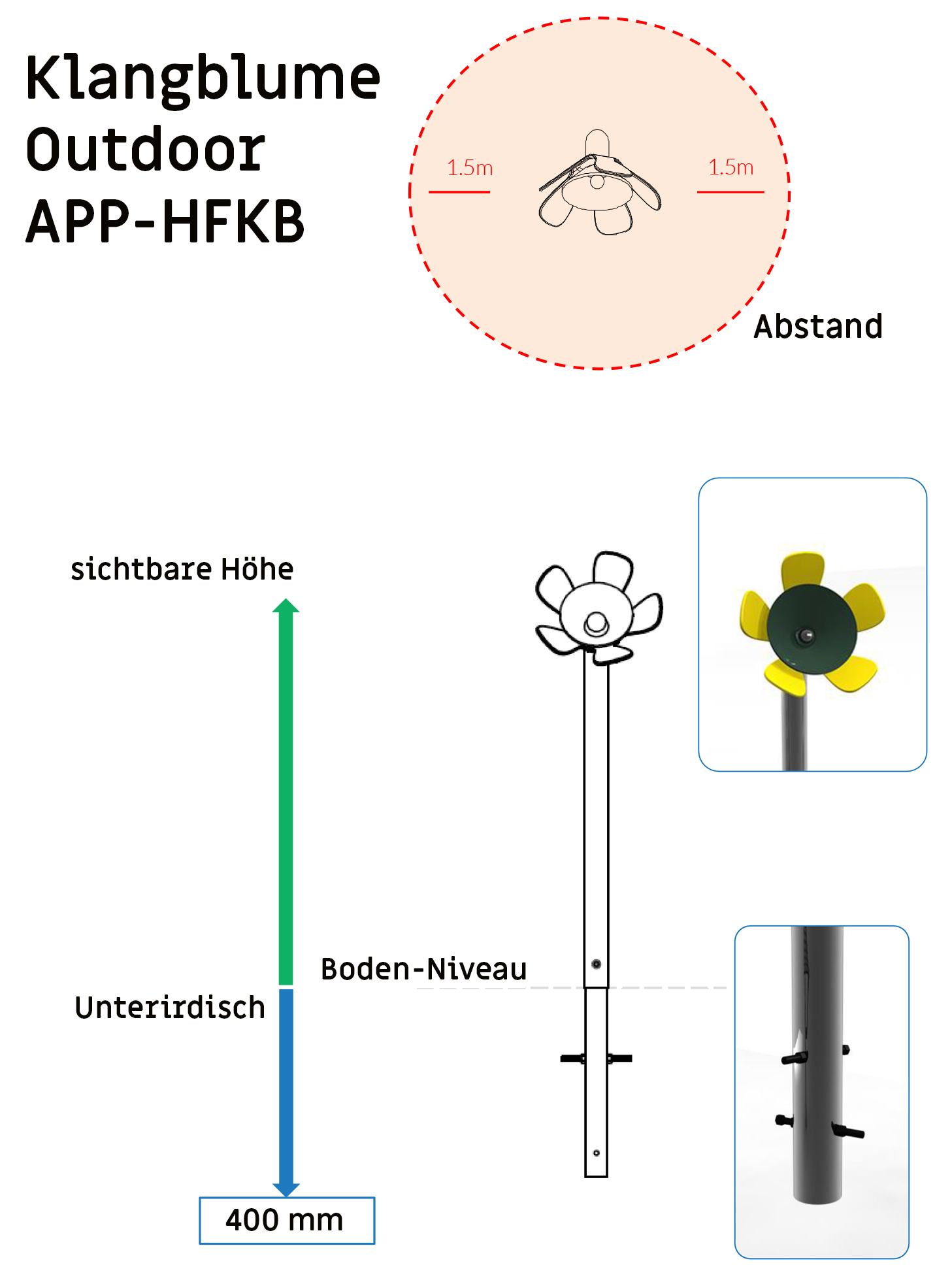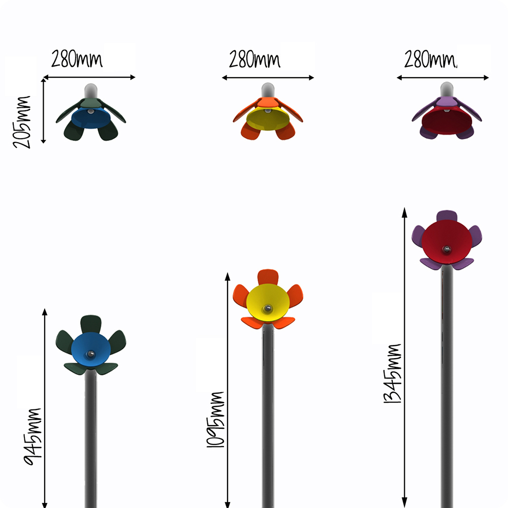 Mit ihrer leuchtend, frischen Farbe lädt diese süße Klangblume sofort zum Spielen ein. Jede Blume besteht aus einem Edelstahlrahmen mit pulverbeschichteten Blumenblättern und Glocken aus Aluminium. Die „Glocken“ singen, wenn sie mit dem beigefügten moosgrünen, Vandalismus resistenten Schlägel angeschlagen werden.