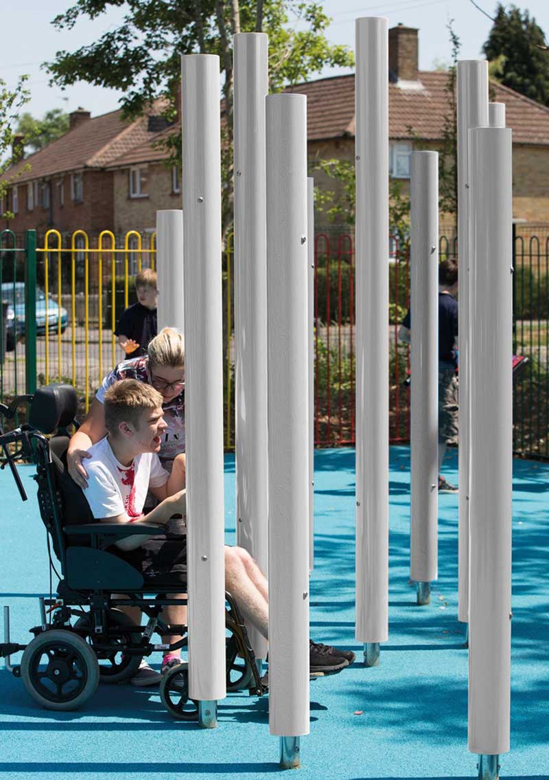 Besucher erleben mit diesem Klangspiel pure Freude am Musizieren im Freien, wenn sie mit den Schlägeln auf die Glocken schlagen. Sind Sie auf der Suche nach einem besonderen Musikinstrument mit einer tiefen Resonanz und viel Nachklang? Dann ist die Klangskulptur „Colossus Chimes“ die richtige Wahl. Sie eignet sich perfekt zur Musiktherapie, für Sinnesgärten oder inklusive Spielplätze. Spieler können spüren, wie der Klang durch ihren ganzen Körper hallt, wenn sie die Glocken berühren, nachdem sie mit den Schlägeln angeschlagen wurden.