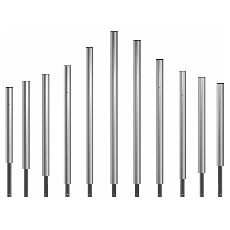 Der aus robustem Aluminium gefertigte Mittelpfosten ist verstärkt, um rauen Umgebungen standzuhalten, und die Außenrohre werden mit Sicherheitsschrauben aus Edelstahl oben und unten befestigt. Jede Glocke ist mit einer Kappe versehen, um zu verhindern, dass Fremdkörper in die Glocke gelangen und den Klang dämpfen.