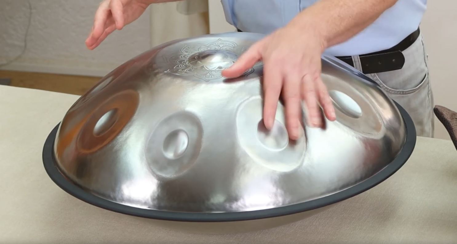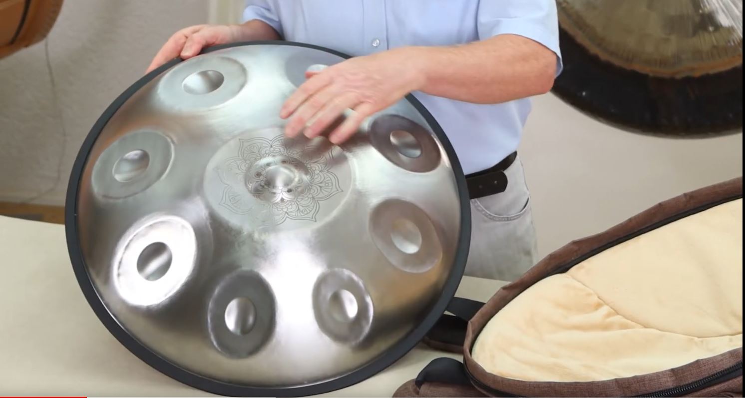 2 konkav zusammengeklebte Edelstahlschalen bilden die futuristisch anmutende Grundform. Die Oberseite mit 9 Klangfeldern gegengewölbt, das größte davon bildet den Mittelpunkt und tiefsten Ton. Die Unterseite ist mit einer mittigen runden Resonanzöffnung versehen. inkl. Rucksack-Tasche