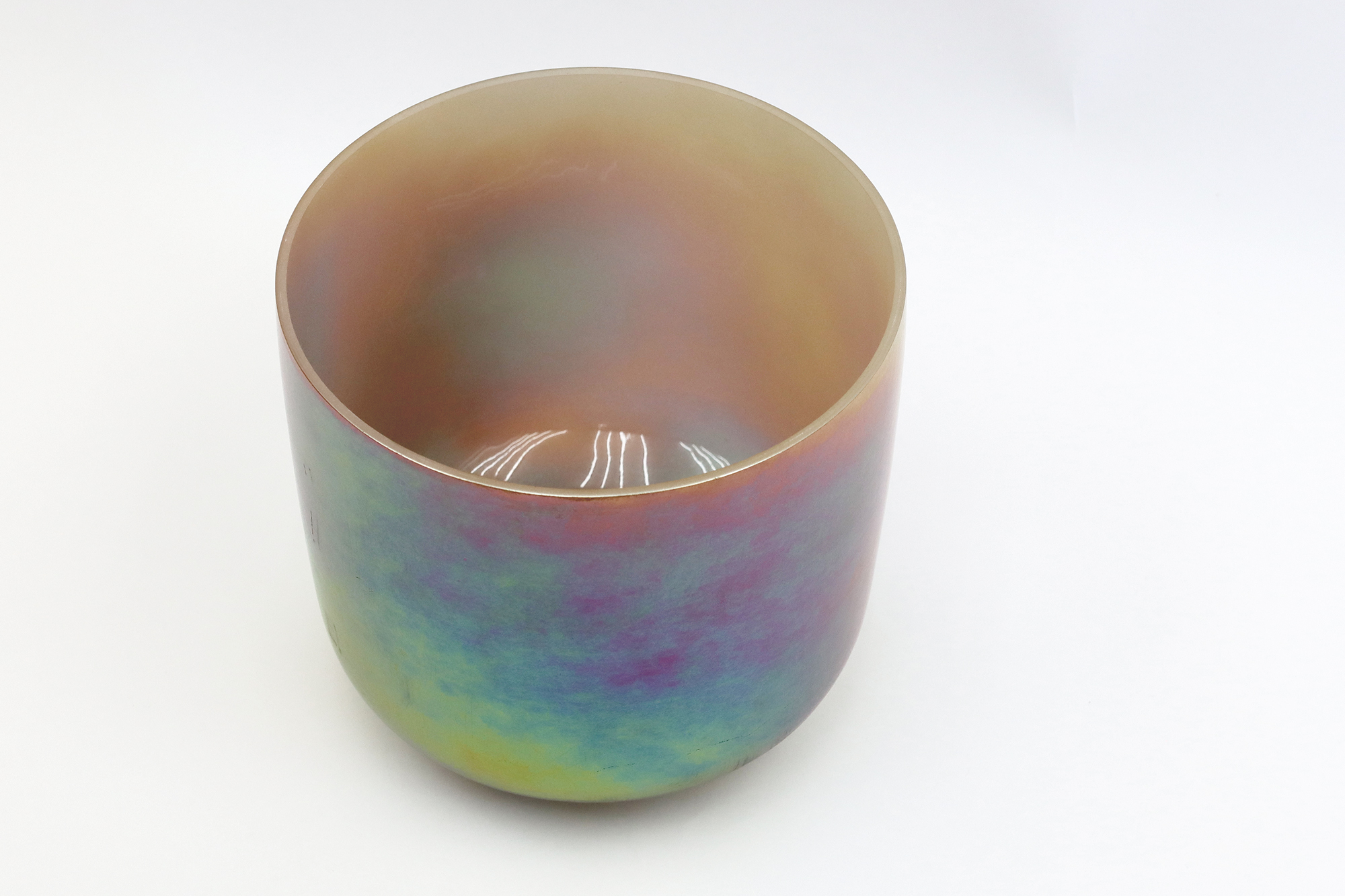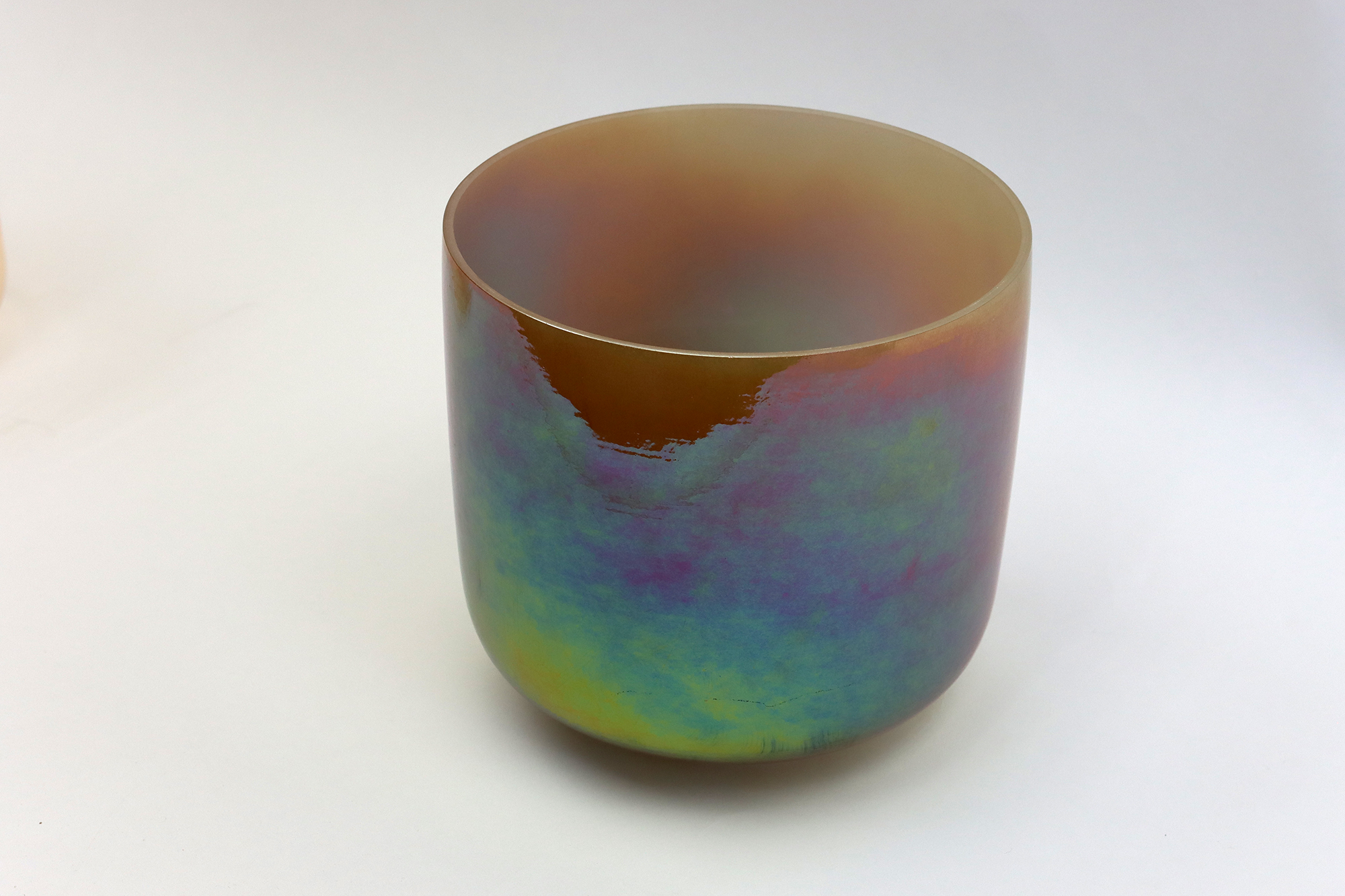 Diese Kristallschale ist nicht lackiert, sondern mit einer Glasur aus seltenen Metallen beschichtet, gemischt, Gold, Silber, Kupfer, Kobalt ... mindestens 5–10 verschiedene Metalle, nur in unterschiedlichen Anteilen, um verschiedene Farben zu erzielen.