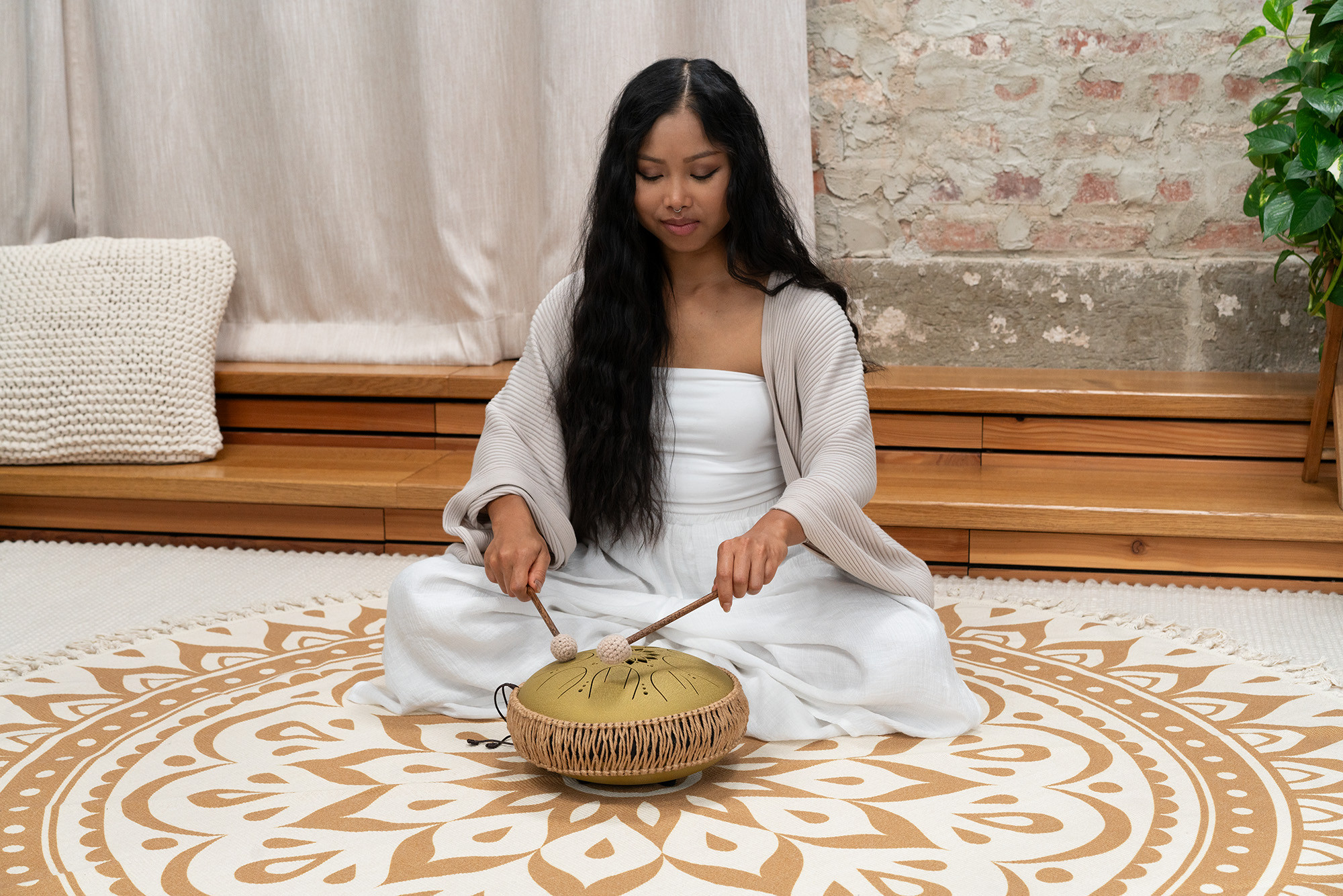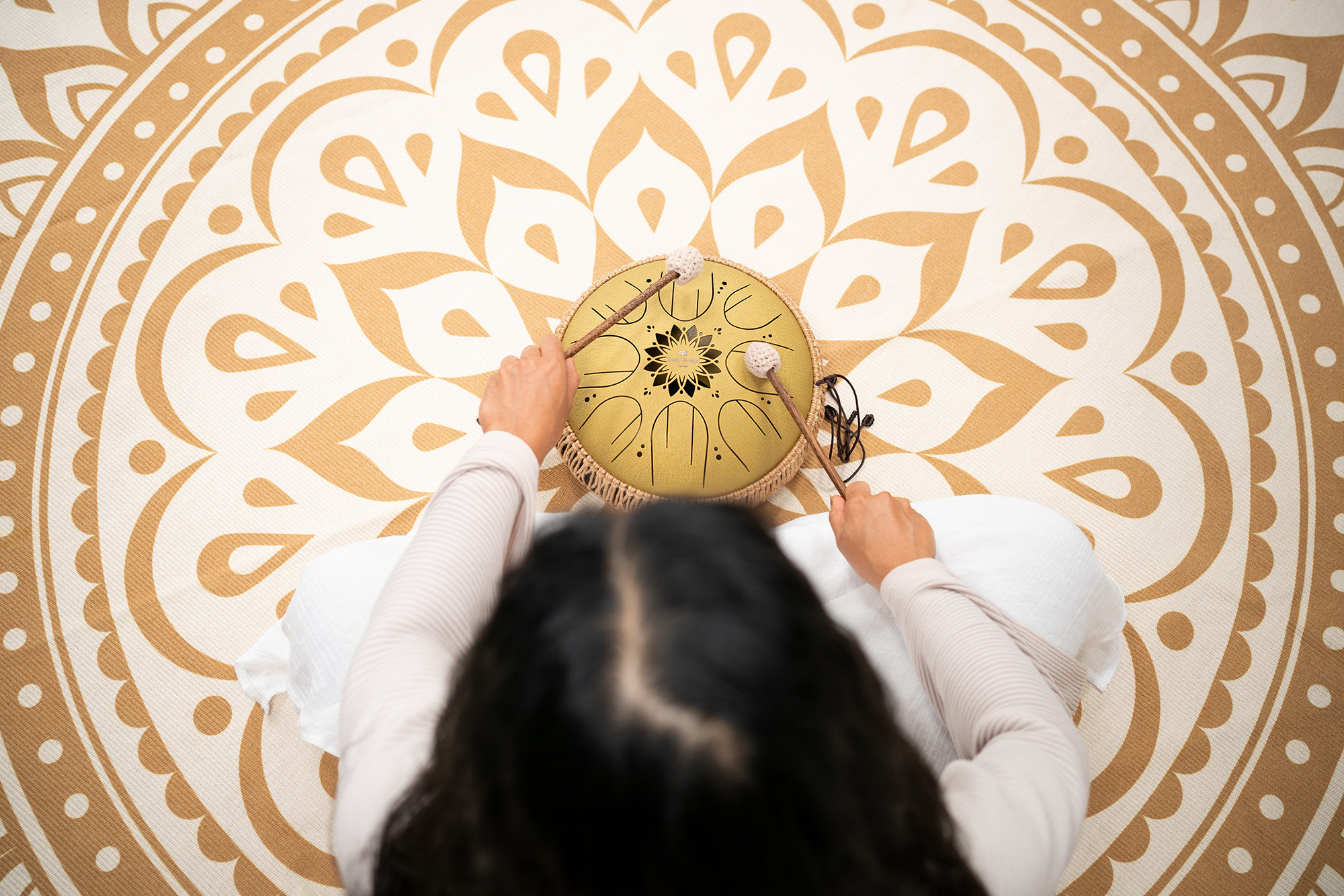 Das Mandalofon „Medium Golden Octave Steel“ ist ein Instrument für Musikliebhaber, Coaches und Klangtherapeuten. Es ist aus hochwertigem Edelstahl gefertigt. Die acht Klangzungen haben zusätzliche Schlitze, damit die Obertöne besser zur Geltung kommen und auch Töne jeweils in zwei Oktaven wiedergegeben werden können. Dadurch entsteht ein wunderbarer, meditativer Klang, der dem einer Handpan ähnelt. Ein Schallloch am Boden der Trommel kann mit einem Silikonstöpsel verschlossen werden, um einen noch kompakteren Klang zu erzielen. Sie kann mit den Fingern oder Schlägeln gespielt werden. Um mit dem Spielen zu beginnen, legen Sie das Instrument einfach auf eine flache Oberfläche oder bequem in den Schoß.