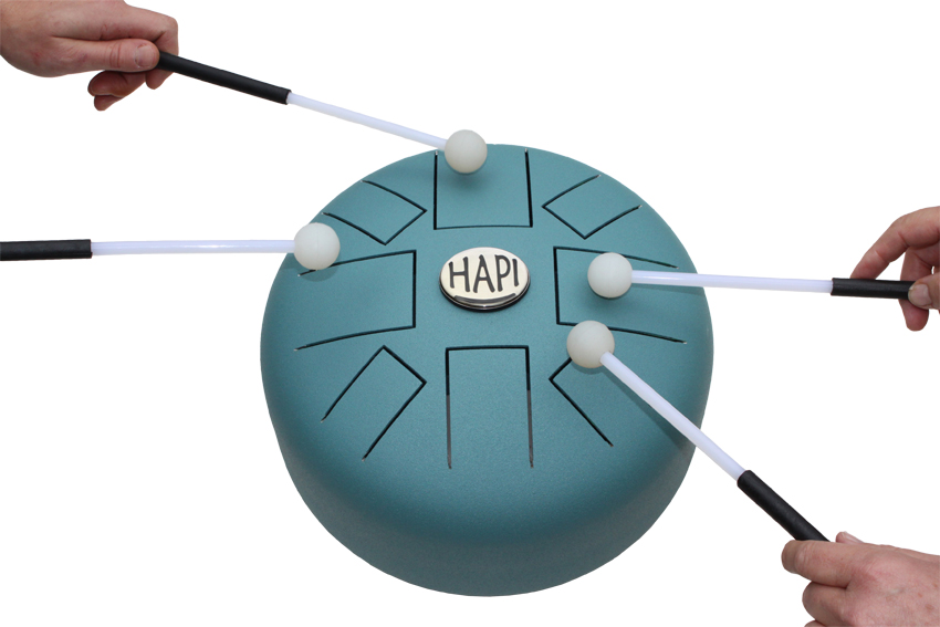 Die HAPI-Drum ist eine spezielle Steeldrum: Eine Art Metall-Schlitz- oder Zungentrommel, die sowohl mit Händen, als auch mit Schlägeln bespielt werden kann. Wunderbar weiche, glockige und meditative Klänge können auch mit nur wenig Übung diesen Instrumenten entlockt werden. Patentiert in USA, hergestellt in Indien. 4,2 kg, 8 Töne, inklusive 1 Paar Silikonschlägel