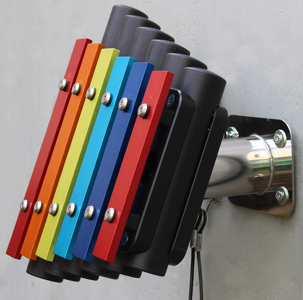 Outdoor-Metallofon RAINBOW, 6 Töne, farbig, C-Pentatonik: C-D-E-G-A, Wandbefestigung