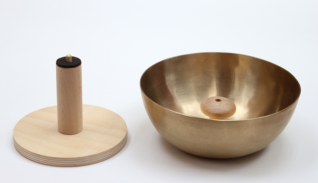 Unsere Griffklangschale Classic ist gefertigt aus einer Peter Hess Therapieklangschale Universal mit einem von uns gedrechselten festverklebtem handlichen Griff aus Buchenholz. Dazu gibt es ein Untergestell, auf die die Schale umgekehrt positioniert werden kann, so dass dort die Hand aufgelegt werden kann, um die Klangschwingung fühlen zu können.