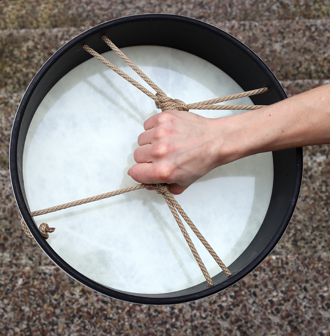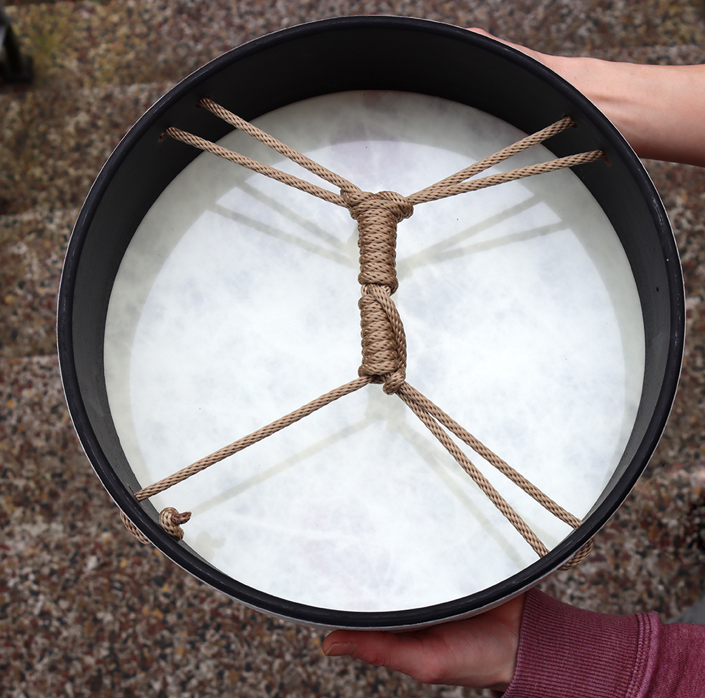 REMO - „Buffalo-Drum“ mit hochwertigem Kunstfell auf Acousticonrahmen bespannt, kein Tierprodukt, auf der Rückseite ein Schnurkreuz als Griff. Beliebt wegen ihres tiefen, bassigen Sounds und der Einsatzmöglichkeit bei jedem Wetter im Freien.