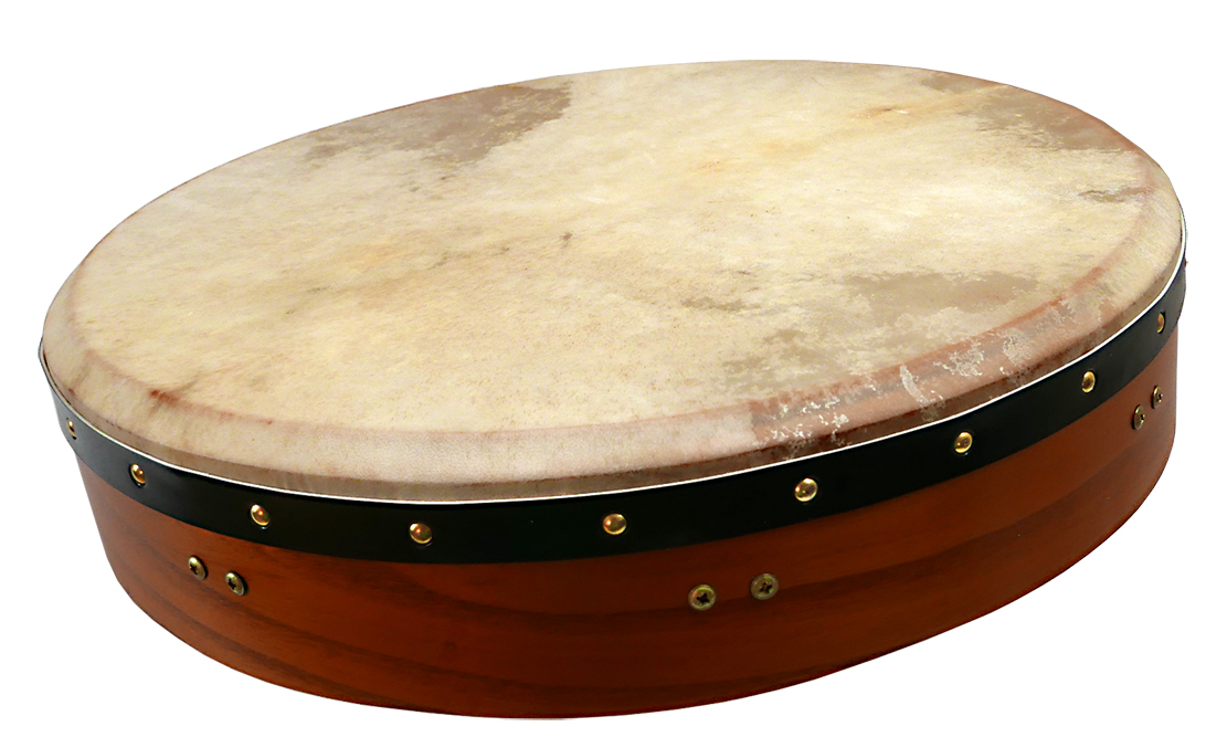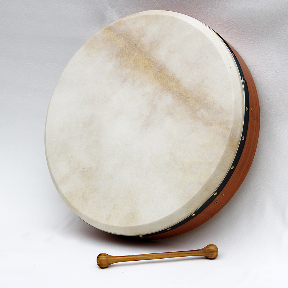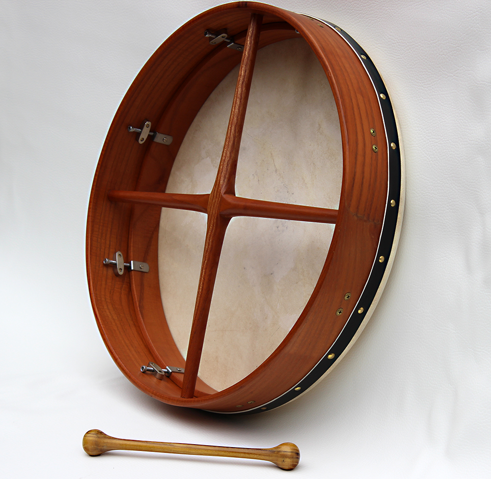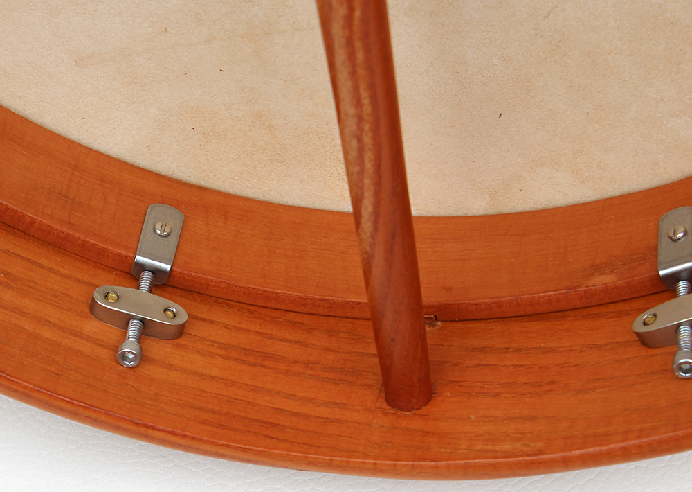 Rahmentrommel mit Ziegenfell aus Indien, stimmbar, Cedar-holz mit Innenring und 8 Winkelschrauben, Haltekreuz aus Holz, inkl. Bodhran-Schlägel, Gewicht: 1460 g