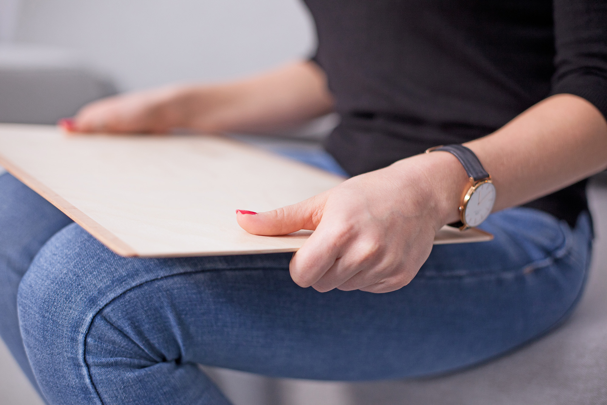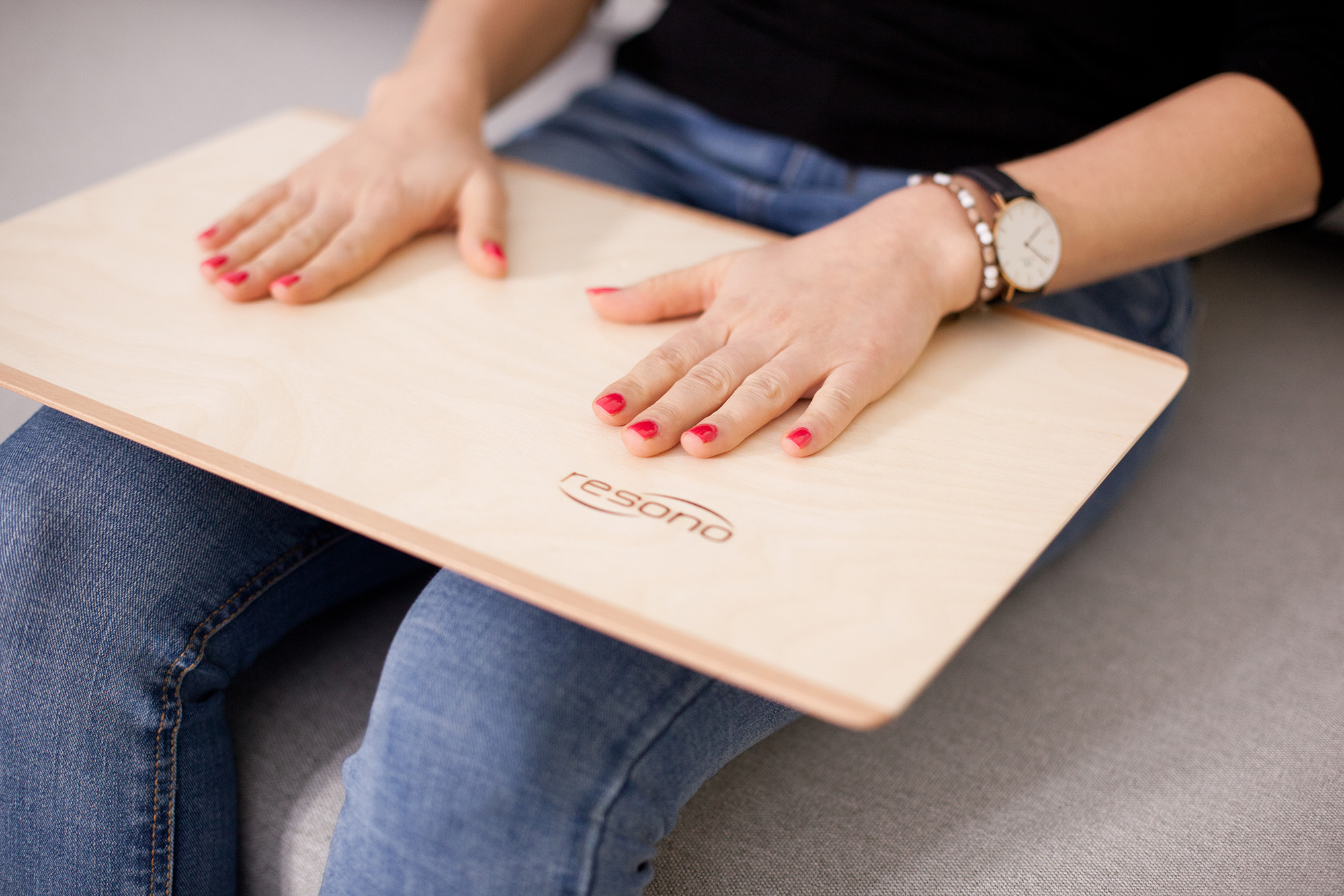 Durch den stabilen Abdeckkasten unter der Holzplatte ist es auch möglich die Füße beim Sitzen auf das SoundPad zu stellen. – Eine Anwendung, die die Wahrnehmungsfähigkeit zum Beispiel bei Menschen mit Polyneuropathie fördern kann.
