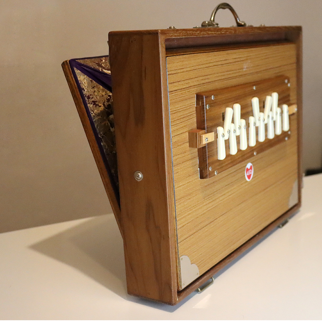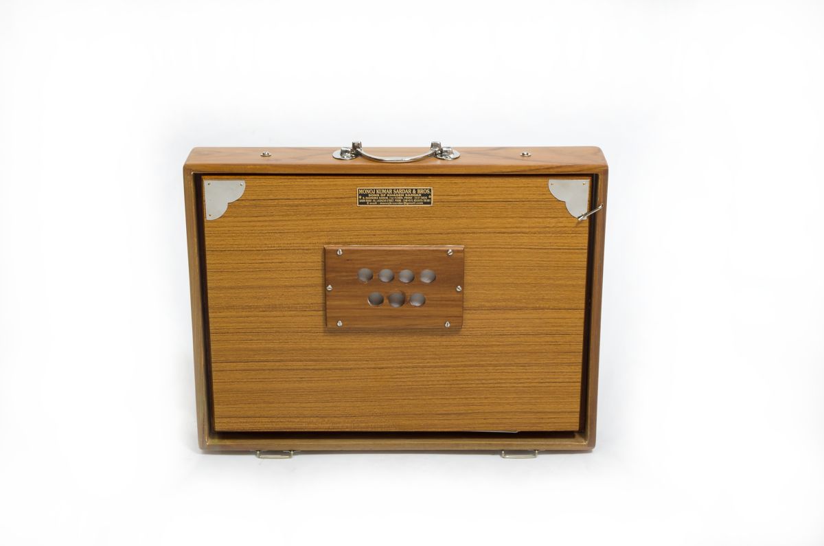 Die Shrutibox Monoj Kumar Sardar groß ist eine etwas schwerere Box mit sehr ausgewogenem, warmem, vollem Ton und großem Rahmen. Durch den großen Rahmen ergibt sich gegenüber den kleineren Modellen ein stark vergrößertes Balgvolumen, das es erlaubt, die Luftzufuhr sehr genau zu dosieren. So lässt sich der Klang mühelos konstant halten, selbst wenn bis zu drei Töne gleichzeitig erklingen. Außerdem kann die Lautstärke wesentlich weiter und feiner variiert werden: Von gleichmäßig zart und leise bis ausdauernd kräftig laut. Der vergrößerte Resonanzraum sorgt zudem für einen etwas volleren Gesamtklang. Trotz der größeren Abmessungen und des höheren Gewichts lässt sich die Shrutibox groß von Monoj Kumar Sardar immer noch problemlos transportieren.