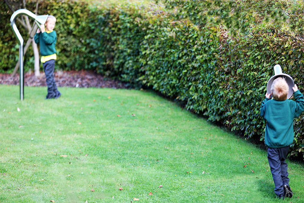 Sprach- und Flüsterrohre aus Edelstahl ermöglichen es zum Beispiel Kindern, über den Spielplatz zu sprechen, zu singen oder zu flüstern. Die Kegel sind in zwei Höhen installiert, um sicherzustellen, dass sie für verschiedene Altersgruppen geeignet sind. Kinder werden begeistert sein, wenn der „Sprecher“ seinen Mund in einen Schallkegel legt und der „Empfänger“ auf der anderen Seite des Spielplatzes in den anderen lauscht, um zu hören, wie die Botschaft durch das Stahlrohr gesendet wird.