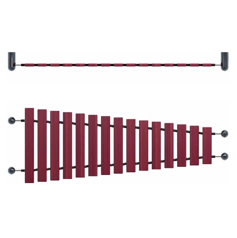 Die Wand-Marimba kombiniert musikalische Kreativität mit platzsparender Effektivität. 15 Klangstäbe werden von einem robusten Edelstahlkabel getragen und bestehen aus glasfaserverstärktem Kunststoff, der auf die diatonische Tonleiter C-Dur abgestimmt ist. Wenn sie mit den angebrachten Schlägeln angeschlagen werden, erzeugen sie einen sanften, warmen und satten Klang. Zwei rote Outdoor-Schlägel sind am Edelstahlseil befestigt.