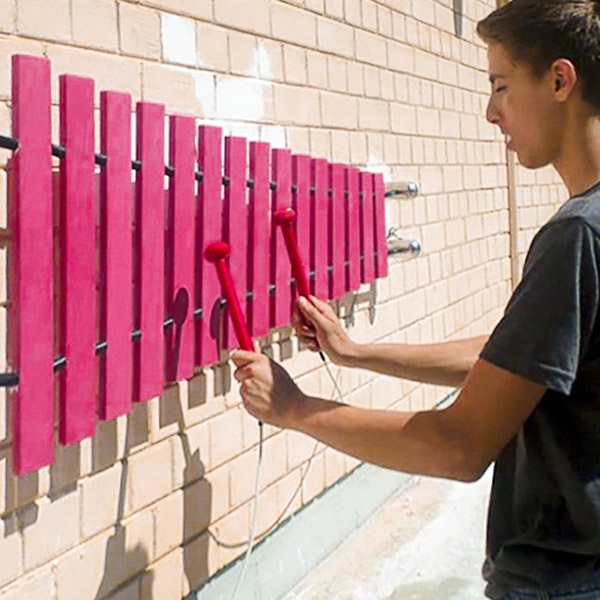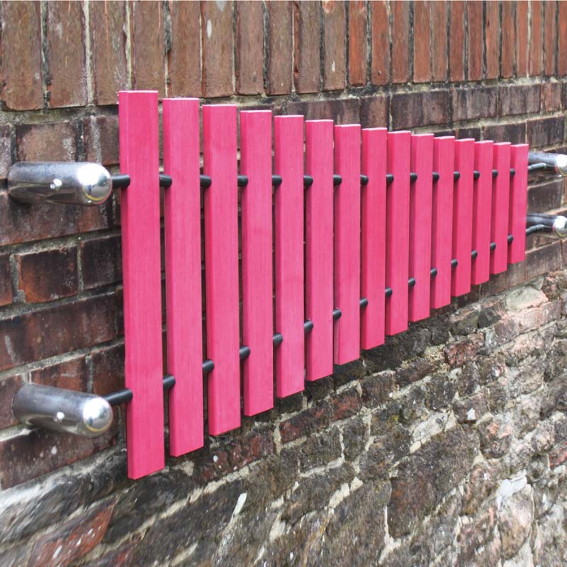 Die Wandhalterungen aus Edelstahl kann auf nahezu jeder Oberfläche angebracht werden. An der Wand montierte Outdoor-Musikinstrumente wie die Wand-Marimba bieten die perfekte Lösung, um einen problematischen oder übersehenen Bereich zu beleben und funktionieren gut, wenn nur wenig Platz zur Verfügung steht, beispielsweise in Innenhöfen, auf überdachten Terrassen oder sogar im Klassenzimmer.