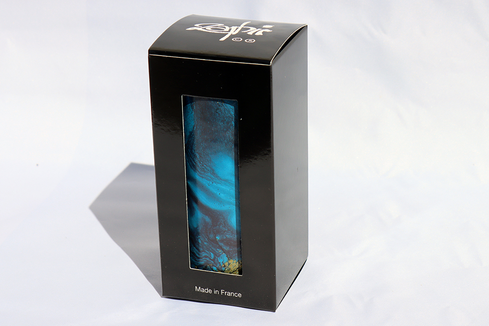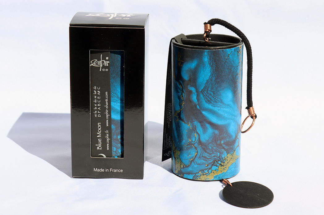 Shanti-Klangspiel ZAPHIR, Melodie Blue Moon, D,F,A,B,C,E,As,C; Maße: 6,5 x 12 cm. Eine wohlklingende kunsthandwerkliche Augenweide aus den Pyrenäen: Ein Glasring bringt die mit Silber verlöteten Metallklangzungen im Inneren des Zylinders (14cm hoch) zum Klingen. Das Shanti-Klangspiel kann man so über eine Tür hängen, dass das Plättchen beim Öffnen der Tür das Klangspiel in Bewegung versetzt und den Gast mit einer schönen Melodie begrüsst. Viele spielen die Klangspiele jedoch auch aktiv: man hält das Spiel an der Kordel oder am oberen Rand des Zylinders und lässt den Ring an den gestimmten Klangzungen entlangkreisen und sich von der wunderschönen Melodie verzaubern. gibt es in verschiedenen Stimmungen und Farben Jedes Klangspiel ist ein Unikat mit einer Umhüllung aus marmoriertem Papier - hergestellt in aufwendiger Präzisionsarbeit einer Manufaktur in den Pyrenäen.