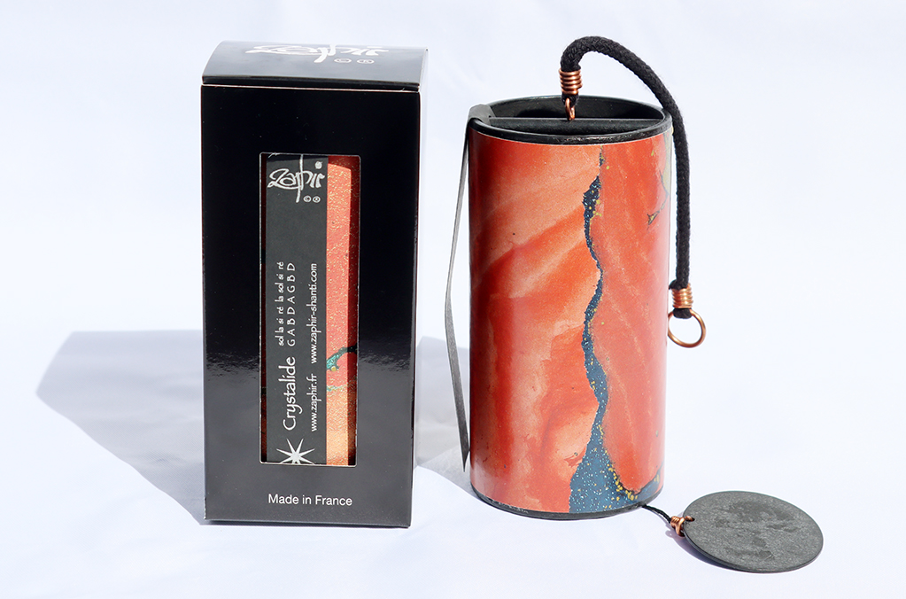 Eine wohlklingende kunsthandwerkliche Augenweide aus den Pyrenäen: Ein Glasring bringt die mit Silber verlöteten Metallklangzungen im Inneren des Zylinders (14cm hoch) zum Klingen. Das Shanti-Klangspiel kann man so über eine Tür hängen, dass das Plättchen beim Öffnen der Tür das Klangspiel in Bewegung versetzt und den Gast mit einer schönen Melodie begrüsst. Viele spielen die Klangspiele jedoch auch aktiv: man hält das Spiel an der Kordel oder am oberen Rand des Zylinders und lässt den Ring an den gestimmten Klangzungen entlangkreisen... Die Shanti-Klangspiele (jetzt unter dem Namen Zaphir) gibt es in verschiedenen Stimmungen und Farben.
