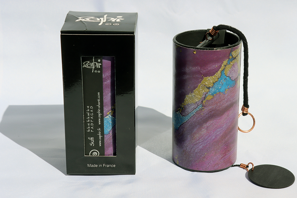 Shanti-Klangspiel ZAPHIR, Melodie Sufi, D,F,A.D,F,A,G,A; 6,5x12 cm. Eine wohlklingende kunsthandwerkliche Augenweide aus den Pyrenäen: Ein Glasring bringt die mit Silber verlöteten Metallklangzungen im Inneren des Zylinders (14cm hoch) zum Klingen. Das Shanti-Klangspiel kann man so über eine Tür hängen, dass das Plättchen beim Öffnen der Tür das Klangspiel in Bewegung versetzt und den Gast mit einer schönen Melodie begrüsst. Viele spielen die Klangspiele jedoch auch aktiv: man hält das Spiel an der Kordel oder am oberen Rand des Zylinders und lässt den Ring an den gestimmten Klangzungen entlangkreisen... Die Shanti-Klangspiele (jetzt unter dem Namen Zaphir) gibt es in verschiedenen Stimmungen und Farben.